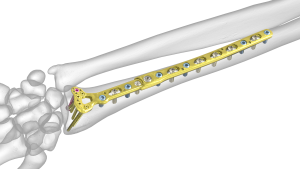 The Dorsal Rim Buttress Plate, designed for distal radius fractures, is positioned on the dorsal ulnar side of the radius. The plate extends radially to support dorsal lip comminution and buttress dorsal fragments. Three screws are designed to target the subchondral bone and support the lunate facet, while a screw can be inserted ulnar-to-radial for further radial styloid support.