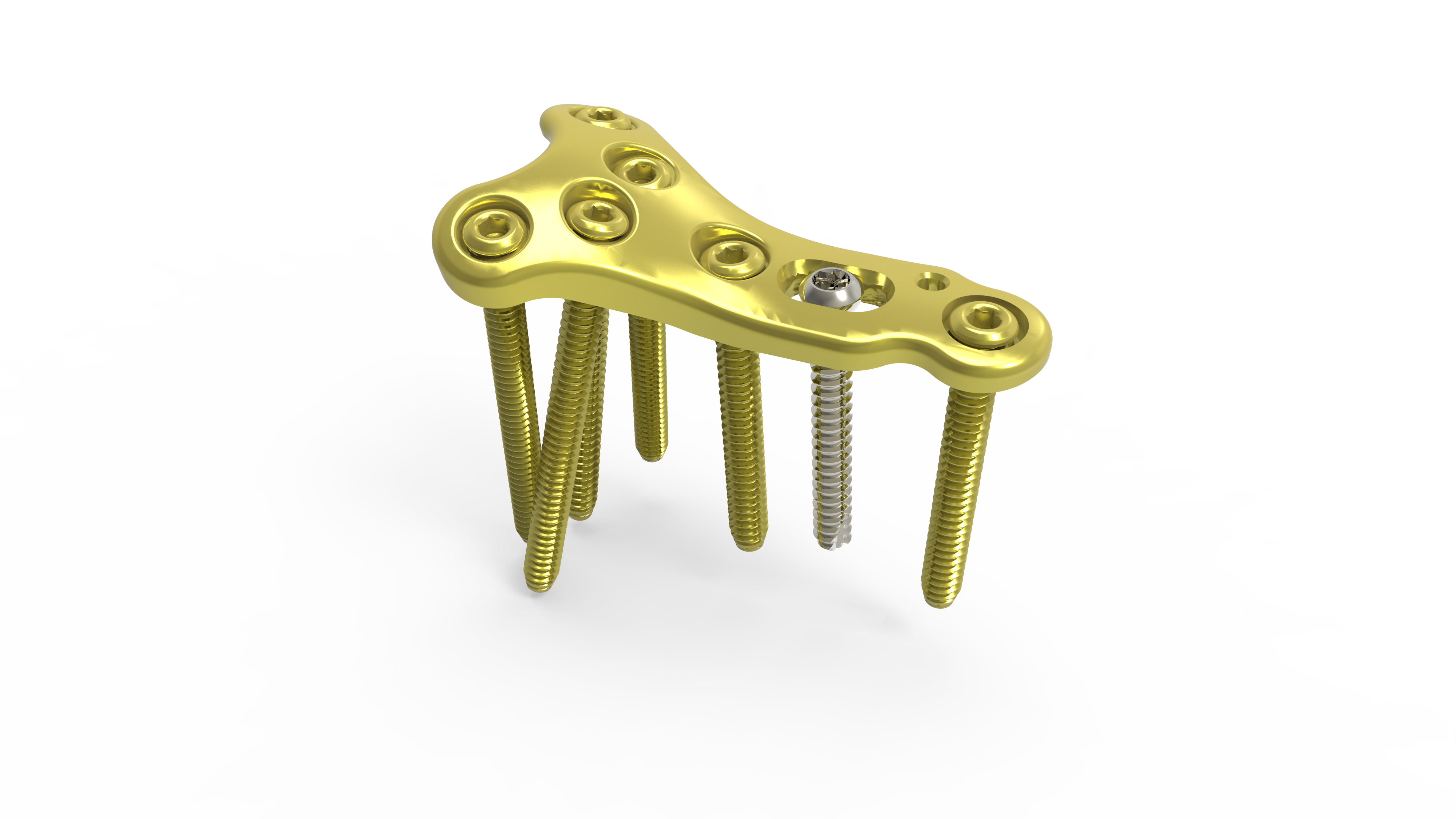 K-wire holes are included in the plate for provisional fixation distally, and specially designed plate tacks may be used for provisional fixation proximally. The benefit of the short length of the Plate Tack is that it is designed to not interfere with the drilling and placement of the proximal screws.
