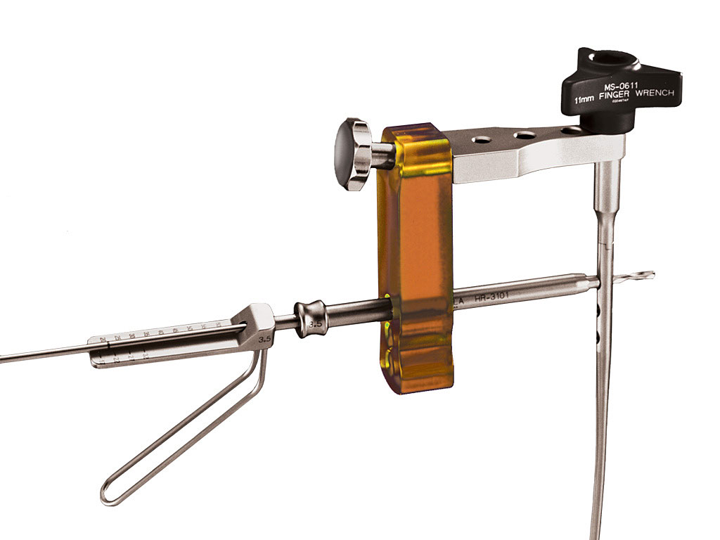 Innovative instrumentation includes a swiveling plate clamp, an angled drill guide, and a soft tissue spreader to aid in plate implantation.