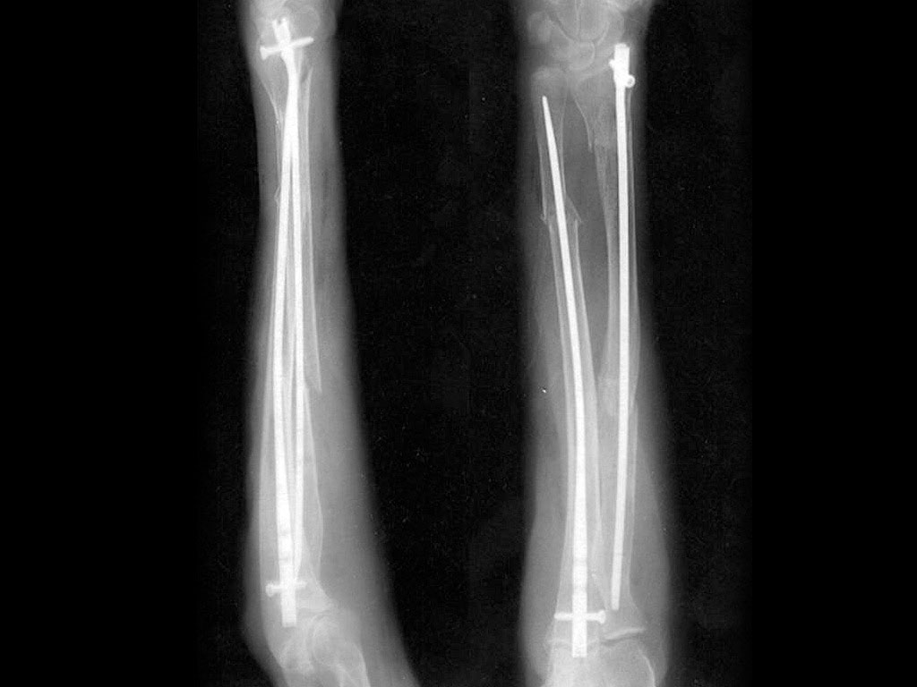 The Acumed Forearm Rod System offers surgeons an alternative option for the treatment of fractures and osteotomies of the radius and ulna over traditional plating. Each fluted rod is designed to be inserted through a small incision with minimal canal reaming. A targeted interlocking screw, combined with a paddle blade tip design, locks and rotationally secures the bone segments to assist in fracture union.